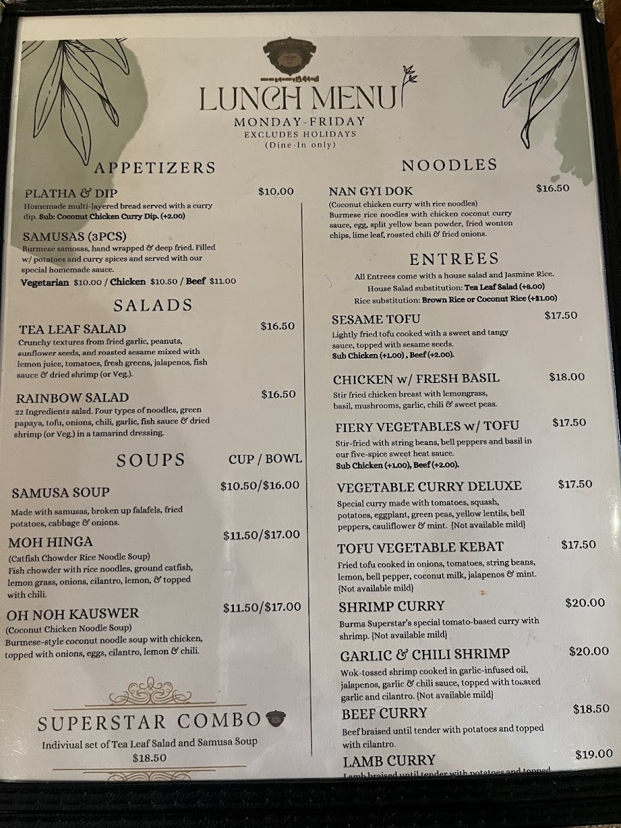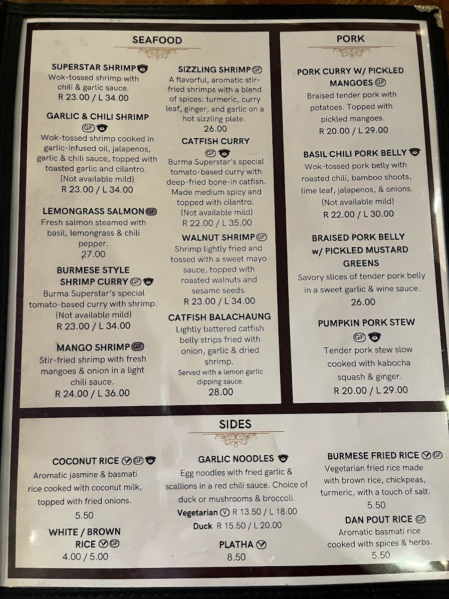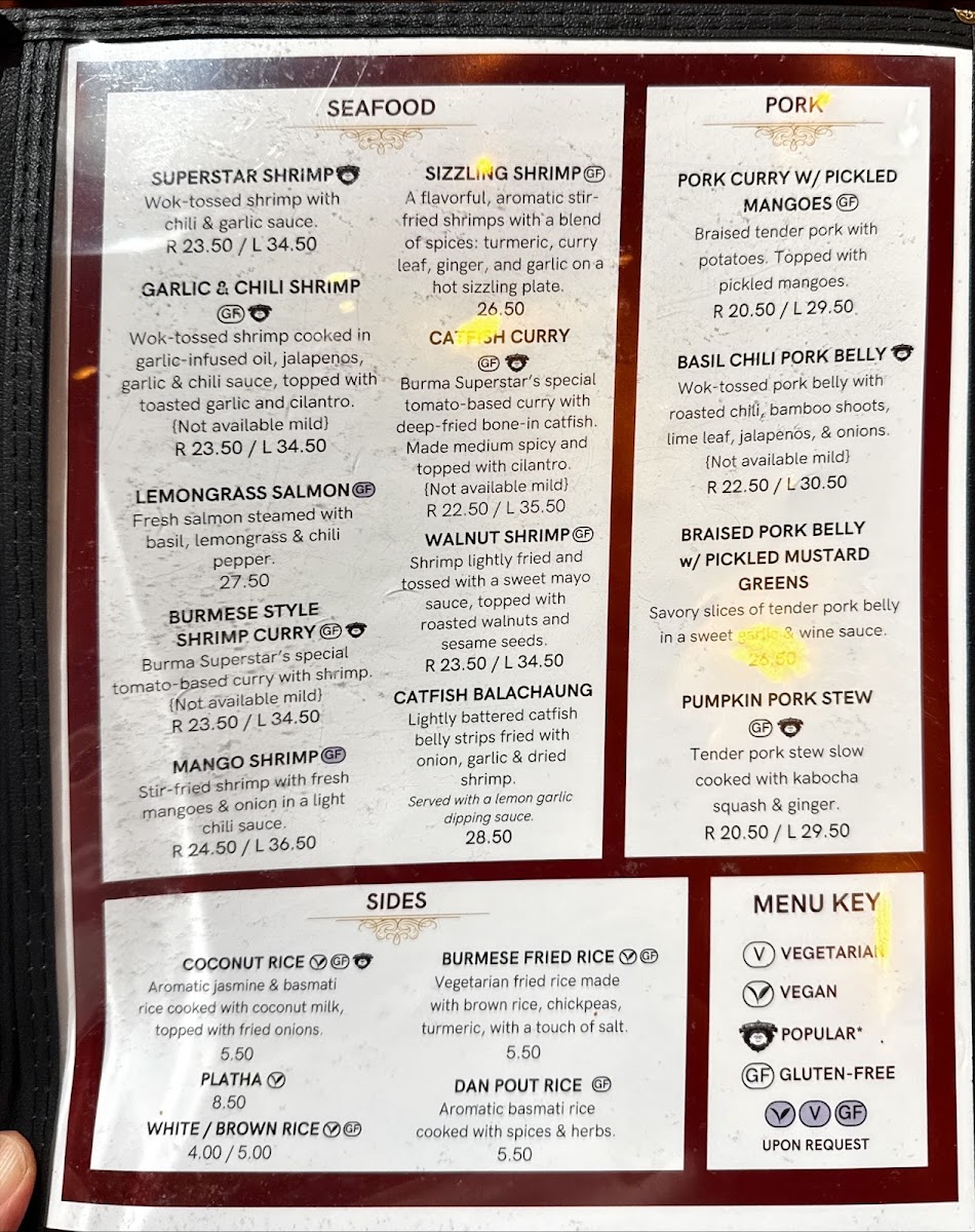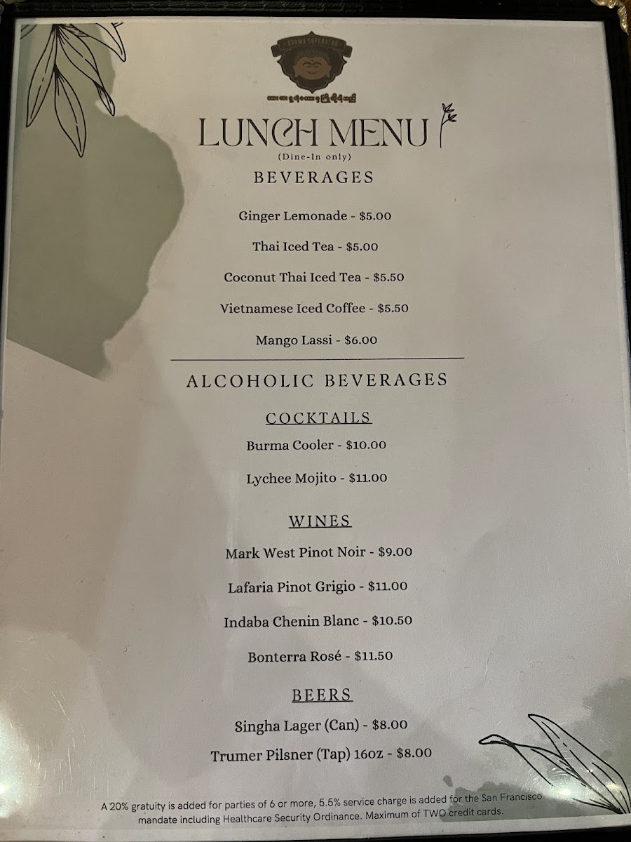Step into Burma Superstar, where the bold flavors of Burmese cuisine come alive in every dish. Located at 309 Clement St in San Francisco, CA, this cozy spot offers a delightful menu that blends traditional Burmese spices with fresh, high-quality ingredients. The Burma Superstar Menu is packed with vibrant, aromatic dishes that cater to all tastes, from savory curries to tangy salads, all bursting with flavor. Whether you're in the mood for something light like the famous tea leaf salad or craving heartier fare like the chicken curry, each plate brings a unique taste of Myanmar. Pair your meal with one of their refreshing beverages or a traditional Burmese dessert for a truly satisfying experience.
